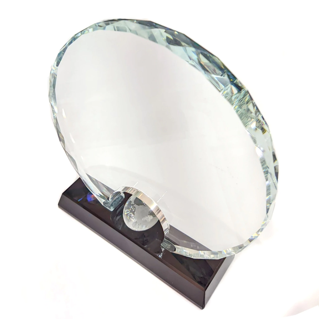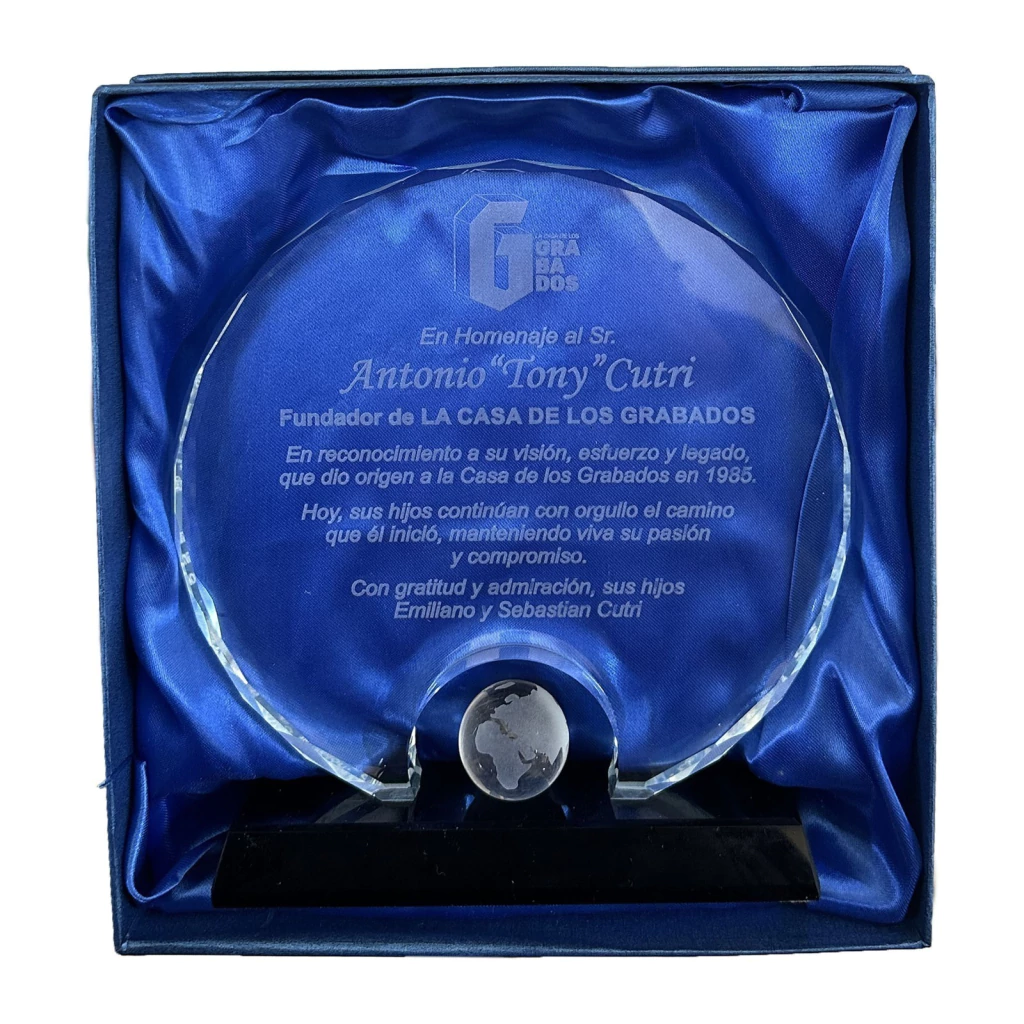 Descubra la sofisticación de nuestra Placa Conmemorativa Circular de cristal, un producto diseñado para honrar y reconocer momentos especiales. Con un diámetro de 18 cm, esta placa destaca por su elegante base rectangular en cristal negro, que aporta un contraste visual impresionante.